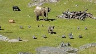 Маленький слон весело карбування птахів, але втратив би його баланс впав на землю. Тоді він буде негайно повернутися до мами, який, здається, трохи турбує її мало.