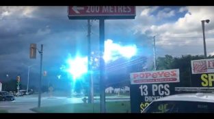 Кілька дуг, створених на лініях високої напруги після зіткнення автомобіля з силовим полюсом. Інцидент стався 24 червня в Лондоні, в Онтаріо, Канада.
