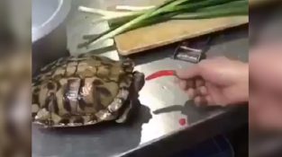 Черепаха намагається перець чилі, і відразу ж бігти, щоб врятувати.