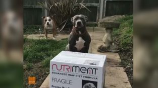 У провінції Суррей, Великобританія, собака відкриває коробку з їжею для собак, який щойно прибув у пошті.