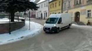 У сніговій сільської вулиці Srebrna Гура в Польщі, ван рухомий плавно дрейфувати.
