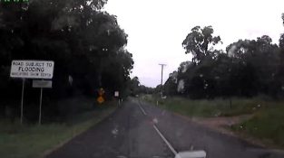 Автомобіліст має неприємний сюрприз під час водіння в гористій вулиці біля Бандаберг, Австралія. раптом, зіткнувшись з затопленої дорогою, яка не могла б уникнути, незважаючи на гальмування. транспортний засіб [...]
