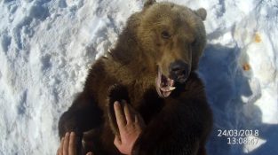 Андрій Іванов з Росії розглядає його зуби Mansour, молодий ведмідь, який живе в заказнику.