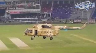 21 березня 2018 року, Каддафі стадіон, в Лахорі, Пакистан: Вертоліт летить над кроком поля, щоб висушити вологий килим, вид матчу в крикет.