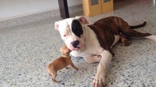 Великий бульдог грає дуже обережно з невеликим щеням чихуахуа.