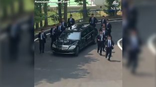 Північнокорейський лідер Кім Чен Ун має автомобіль після зустрічі зі своїм південнокорейським колегою, у супроводі 12 охоронців, що бігли поруч з транспортним засобом.