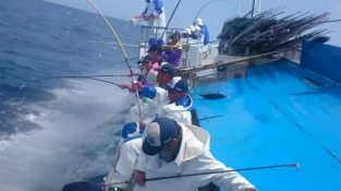 У риболовецькому судні в Японії, ряд рибалок стоїть на одній стороні, а інша приманка летить в воді. Використання приманок, риба дуже швидко велике смугасте стадо приходить [...]