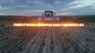 Фермер використовує трактор інструменту, який вбиває бур'яни з вогнем. Пристрій спалювання пропану використовується для вирощування кукурудзи без пестицидів.