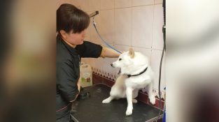 У салоні для собак в Литві, жінка вдається заспокоїти собаку, яка виглядає переляканою.