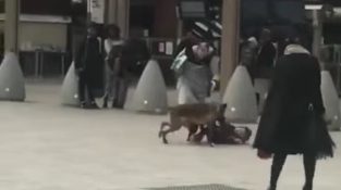 Поза залізничної станції Роса-парків в Парижі, людина буде відштовхувати собаку борець рухається, який, здається, щоб напасти на маленький дитина.