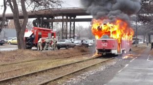 Короткий трамвайний вагон у вогні причини Запорізького України. Інцидент стався 24 листопада 2015 року.