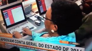 Жінка в парламенті Анголи прикидаючись друкувати на комп'ютері, при натягу відеокамери.