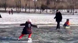 На замерзлому озері в Китаї, маленька дівчинка 4 років ковзанів, як профі.
