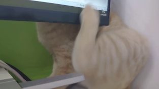 Кішка хоче почухати голову, але заважає екран комп'ютера.