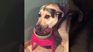 Собака в відео, записане власником під час їжі, і залишає йому «подарунок», коли той наближається зі своїм мобільним телефоном.