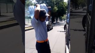Дистриб'ютору вдається нести 5 великих ємностей з 20 літрами води на полицях магазину. Він кладе 3 контейнери на плечі та голову, і 2 контейнери під одну руку.