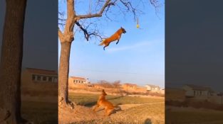 Два німецька вівчарка намагається досягти м'яч, Вони розташовані занадто високо на гілці дерева.