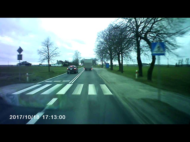 پولینڈ میں ایک موٹرسائیکل دوہری مسلسل لائن والی سڑک پر اوور ٹیک کرنے کی کوشش کر رہا ہے۔, جہاں اوور ٹیکنگ منع ہے۔. بدقسمتی سے اس کے لیے, ایک گشتی گاڑی اس کے بالکل سامنے ہے۔.