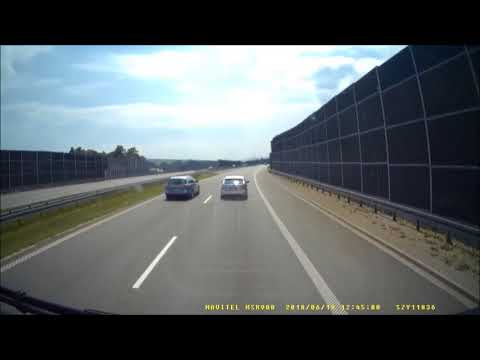 دو کاریں ہائی وے پر ایک ٹرک کے آگے بریک لگا رہی ہیں۔ (پولینڈ).