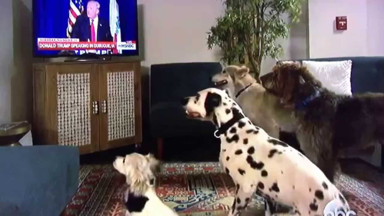 جب وہ ٹی وی پر ڈونلڈ ٹرمپ کی تقریر دیکھ رہے ہیں۔, تین کتے امریکی صدر کے حکم کی تعمیل کرتے ہیں جب وہ چیختا ہے 'بیٹھ جاؤ!'.