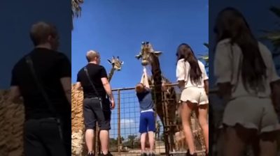 چڑیا گھر میں, ایک چھوٹا لڑکا ایک بڑی شوٹ کے ساتھ زرافے کو کھلاتا ہے۔. بچے کو تنے سے پکڑا جائے گا۔, جیسے ہی زرافہ اسے کھینچتا ہے اور اپنا سر اٹھاتا ہے۔.