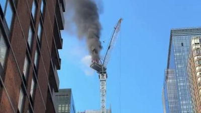 بدھ، 26 جولائی، 2023 کو مین ہٹن، نیویارک میں, عمارت کی تعمیر کے لیے استعمال ہونے والی کرین کی ٹیکسی۔, آگ لگ گئی جس کی وجہ سے اس کی بوم ہیلس کچن کے علاقے میں سڑک کے بیچ میں گر گئی۔ (41 ویں اور 10 ویں گلیوں کے درمیان).