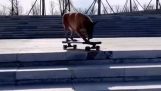 کتا اسکیٹ بورڈ کے ساتھ قدموں کی اترتا ہے