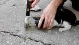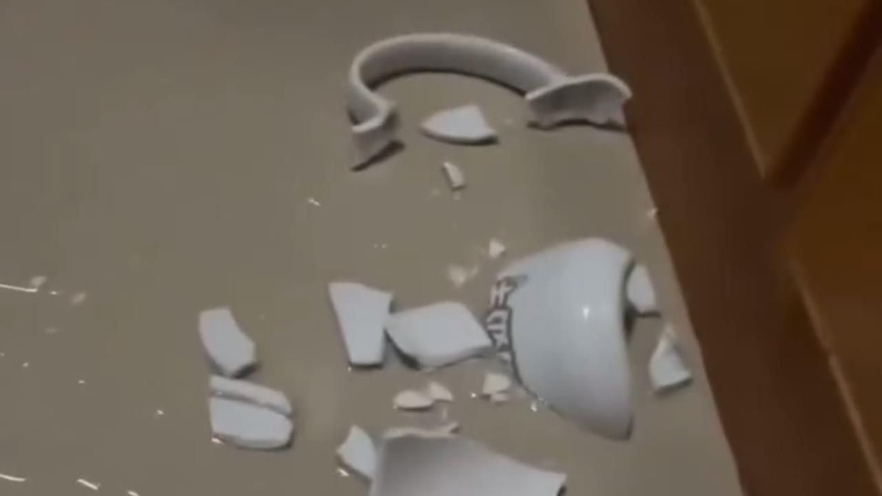اس کے منہ میں ایک بڑی جعلی ہڈی لینے کے بعد, ایک کتا اس کے ساتھ ایک گلدان توڑتا ہے۔. یہ جاننا کہ اس نے کیا کیا ہے ...