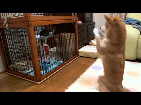 شیبا انو کتا ایک چھوٹی بلی کے بچے کے ساتھ بات چیت کرنے کی کوشش کرتا ہے۔.