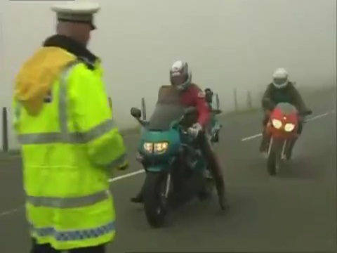 برطانیہ میں ایک پولیس افسر ایک موٹر سائیکل سوار کو چیک کرنے کے لیے روک رہا ہے۔, جب کہ اس کے بعد ایک دوسرے موٹر سائیکل سوار کی وجہ سے حادثہ پیش آتا ہے جس کے پاس دھند اور گیلی سڑک کی وجہ سے ردعمل ظاہر کرنے کا وقت نہیں تھا۔.