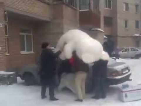 مزاحیہ منظر, تین روسیوں کے ساتھ ایک بڑے ٹیڈی بیئر کو اپنے لاڈا میں فٹ کرنے کی کوشش کر رہے ہیں۔.