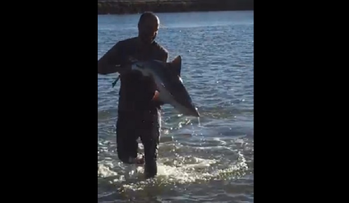 آسٹریلیا میں, ایک آدمی اپنے ہاتھوں سے شارک پکڑتا ہے۔, جیسے مچھلی اتھلے پانی میں تیرتی ہے۔.