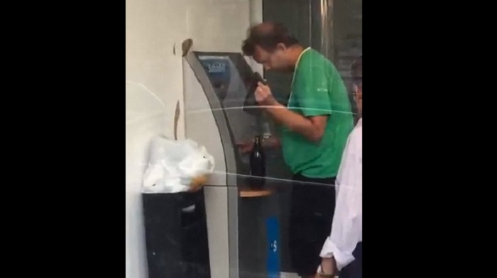 بیئر کی بوتل کے ساتھ, ایک نشے میں دھت آدمی اے ٹی ایم سے کیش نکالنے کی کوشش کرتا ہے…