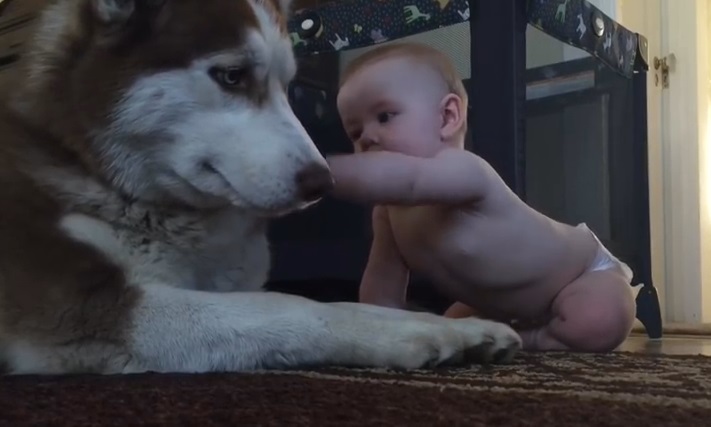 ایک پیارا ہسکی بچے کی پکار کا جواب دیتا ہے اور اس کے ساتھ کھیلنے کے لیے لیٹ جاتا ہے۔.