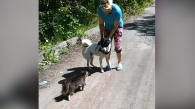 روس کے ایک پارک میں سیر کے دوران, ایک بلی اپنے مالک کے ساتھ کتے سے ملے گی۔. بلی کتے کی طرف بڑھے گی اور پھر بغیر کسی ہچکچاہٹ کے اس پر حملہ کرے گی۔. مالک بدقسمت کتے کو بلی کے مسلسل حملوں سے بچانے کی کوشش کرتا ہے۔, اسے ہوا میں اٹھانا.