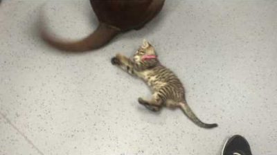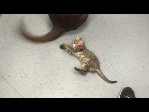 بلی کا بچہ ڈاگ ٹیل کے ساتھ کھیلتا ہے۔