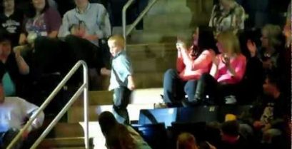 ایک بچہ میدان میں شو چرا رہا ہے۔, راسکل فلیٹس کنسرٹ کے دوران.