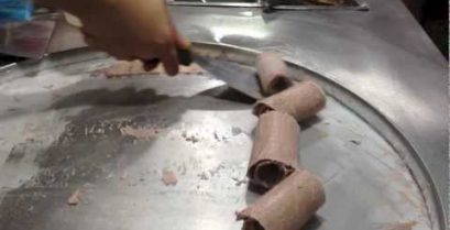 فوکٹ، تھائی لینڈ میں ایک گلی فروش فوری چاکلیٹ آئس کریم بناتا ہے۔, کیلا اور سٹرابیری.