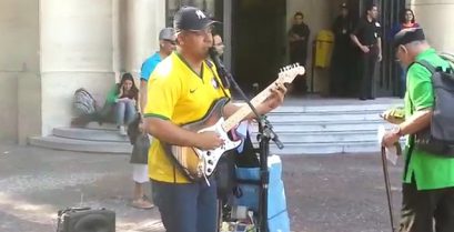ایک موسیقار اپنا گٹار خوبصورتی سے بجاتا ہے اور ڈائر سٹریٹس کا 'سلطان آف سوئنگ' گاتا ہے, ساؤ پالو کے مرکز میں, برازیل میں.