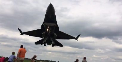 نیویارک میں منعقدہ 2014 وڈنگٹن ایئر شو میں, ایک F-16 جیٹ طیارہ تماشائیوں سے چند میٹر اوپر سے گزرتا ہے۔.
