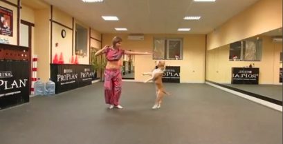 ایک تربیت یافتہ پٹ بیل اپنے مالک کے ساتھ مختلف رقص کرتا ہے۔, مشرقی رقص میں.