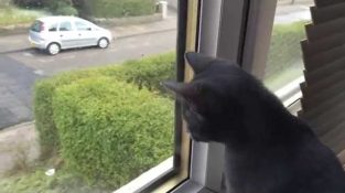 ایک چھوٹی بلی کا بچہ کھڑکی پر کھڑا ہے اور برف کے تودے پکڑنے کی کوشش کر رہا ہے۔. اس کے مالک کے مطابق, اس نے پہلی بار برف دیکھی ہے۔.