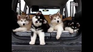 ایک گاڑی کے پیچھے, 5 الاسکا مالاموٹ کتے موسیقی سنتے ہوئے اپنے سروں کو مضحکہ خیز بناتے ہیں۔.