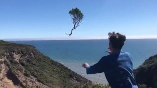 ایک آدمی چٹان سے شاخ گراتا ہے۔. تیز ہوا کے ساتھ, شاخ بومرینگ کی طرح کام کرتی ہے اور واپس اپنے ہاتھوں میں آتی ہے۔.