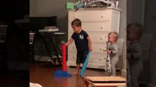 ایک چھوٹا لڑکا غلطی سے اپنے چھوٹے بھائی کو مارے گا۔, ایک پلاسٹک بیس بال بیٹ کے ساتھ.