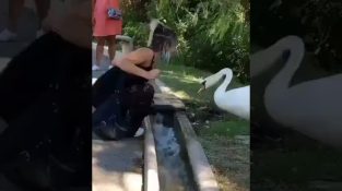 ایک ہنس ایک عورت کے چہرے پر نقاب لگانے آتا ہے۔.