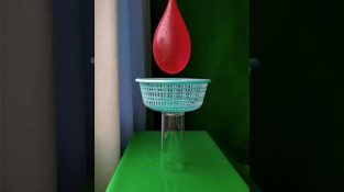 پانی کی طرف سے سست رفتار میں پیدا ہونے والا متاثر کن اثر, جب یہ غبارے سے نکل کر ایک کولنڈر میں گرتا ہے۔.