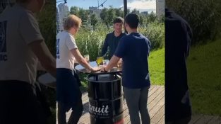 میلبورن، آسٹریلیا کی ایک لیبارٹری میں, ایک آدمی کمپریسڈ ہوا کے ساتھ ایک سیب کو اٹھاتا اور گھماتا ہے۔. اس کے بعد سیب تیزی سے گھومنا شروع کر دیتا ہے اور پھٹ جاتا ہے۔.