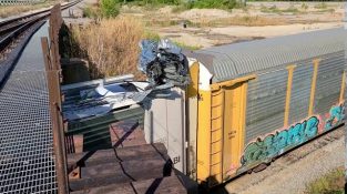 ٹرین کی چھت ڈبے کی طرح کھلتی ہے۔, جب اس کی ویگنیں ایک نچلے پل کے نیچے سے گزرتی ہیں۔.
