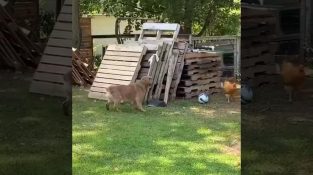 ایک مرغی اور کتا ایک ساتھ کھیل رہے ہیں۔